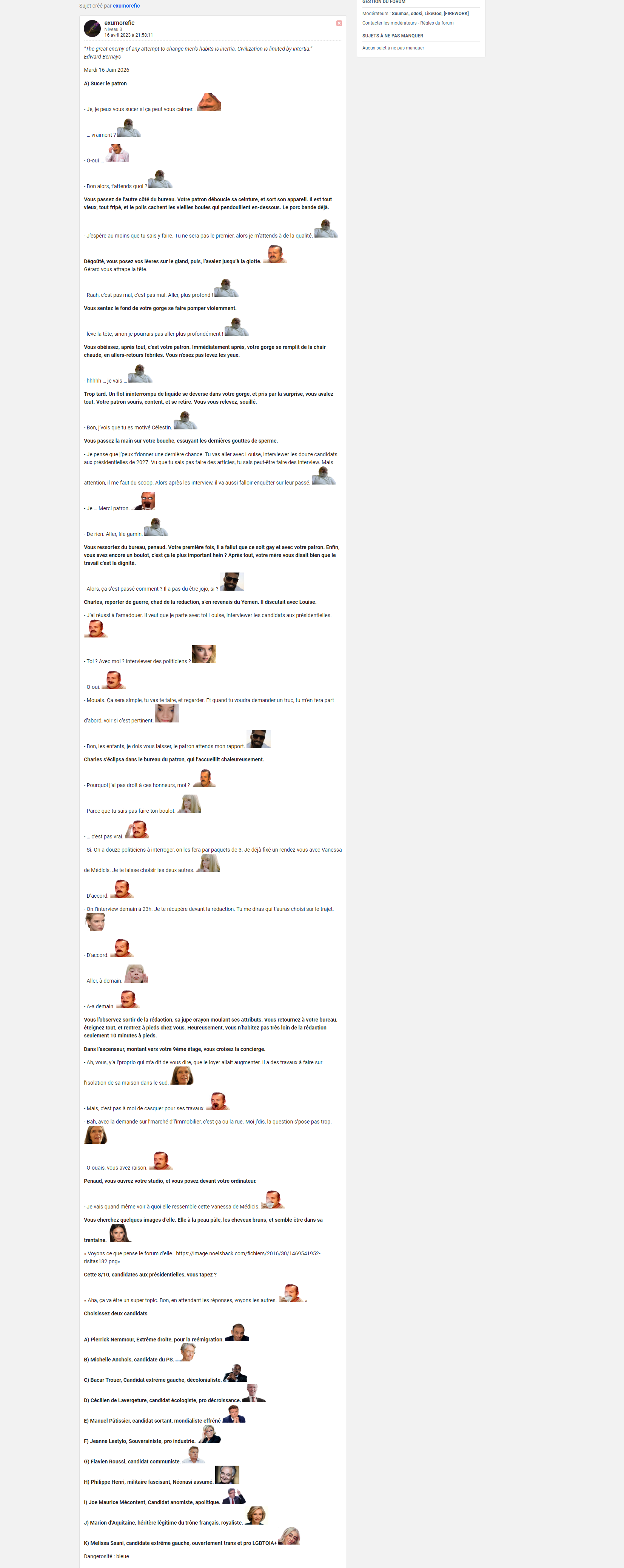 - Ben voilà, le patron me pose un ultimatum, et je dois faire sortir des scoops de malade pour garder mon poste. Là il m’a mit sur la campagne pour 2027. Je dois chercher et sortir des dossier sur les candidats.