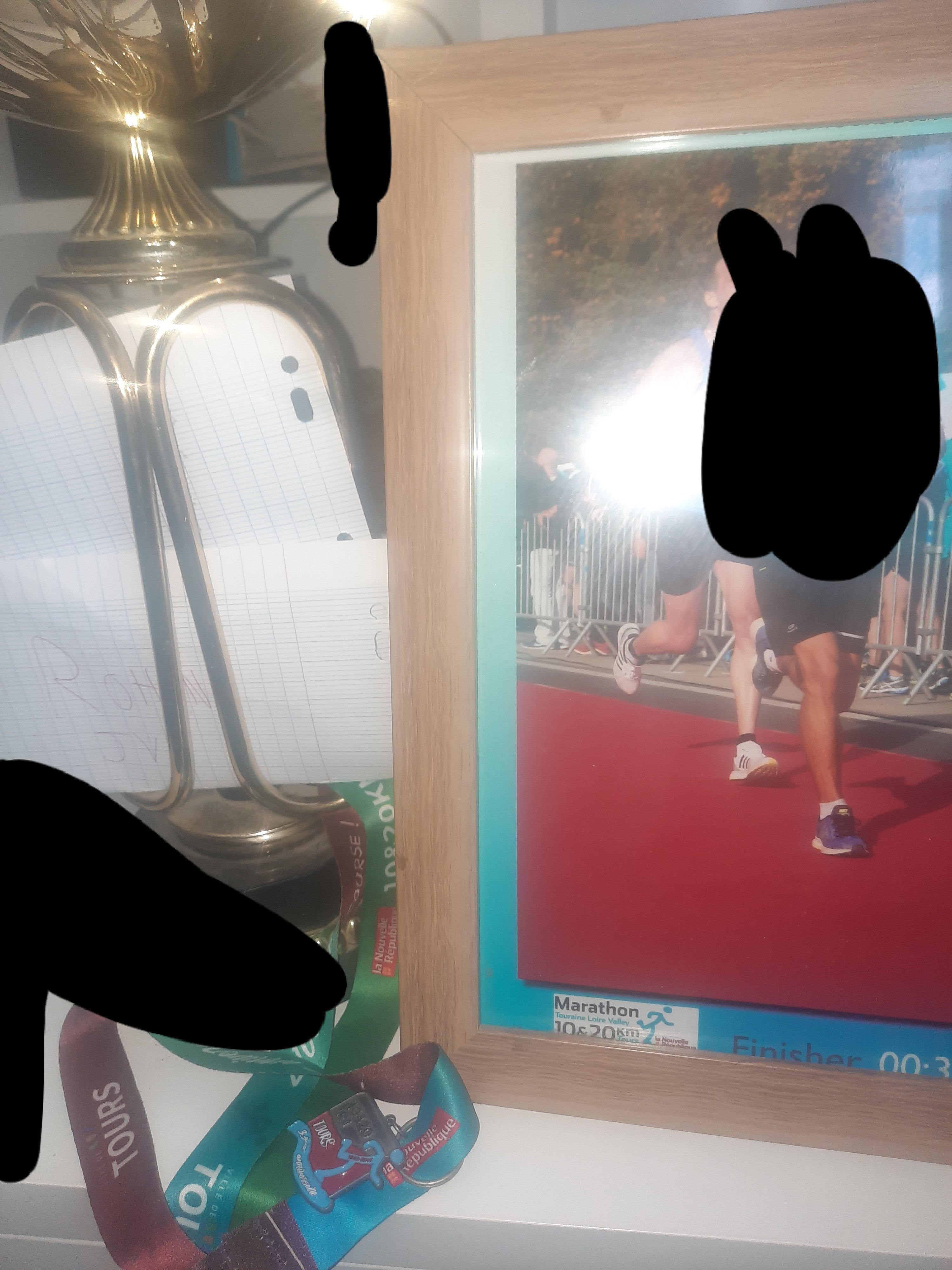 La photo encadrée, le trophée réservé au top 100 des coureurs chaque année, la médaille, les stats Strava avec les données gps + le classement de la vraie course que j'ai posté, tout ca c'est fake