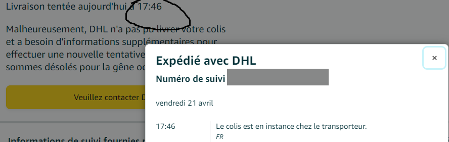 Bonsoir les kheys j'ai peur d'avoir perdu un colis qui à été mis en instance chez le transporteur suite à une livraison raté alors que j'étais à domicile toute la journée ; je me demande si il y a pas une erreur de suivi le suivi DHL m'indique pas pareil que le suivi Amazon