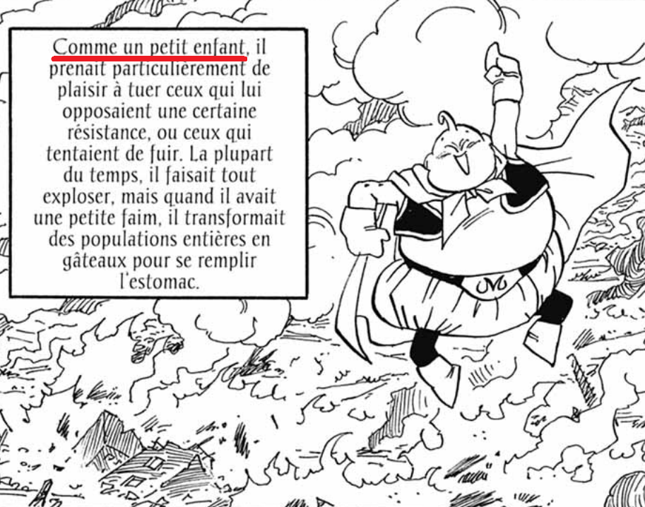 Mais du coup si tu ne faisais pas allusion à cette expression, je ne comprends pas pourquoi tu repars sur l'argument comme quoi Fat Buu « aime prendre plaisir à tuer ceux qui fuient ou qui résistent », alors qu'il ne se rend même pas compte de ce qu'il fait, tel un « petit enfant »...