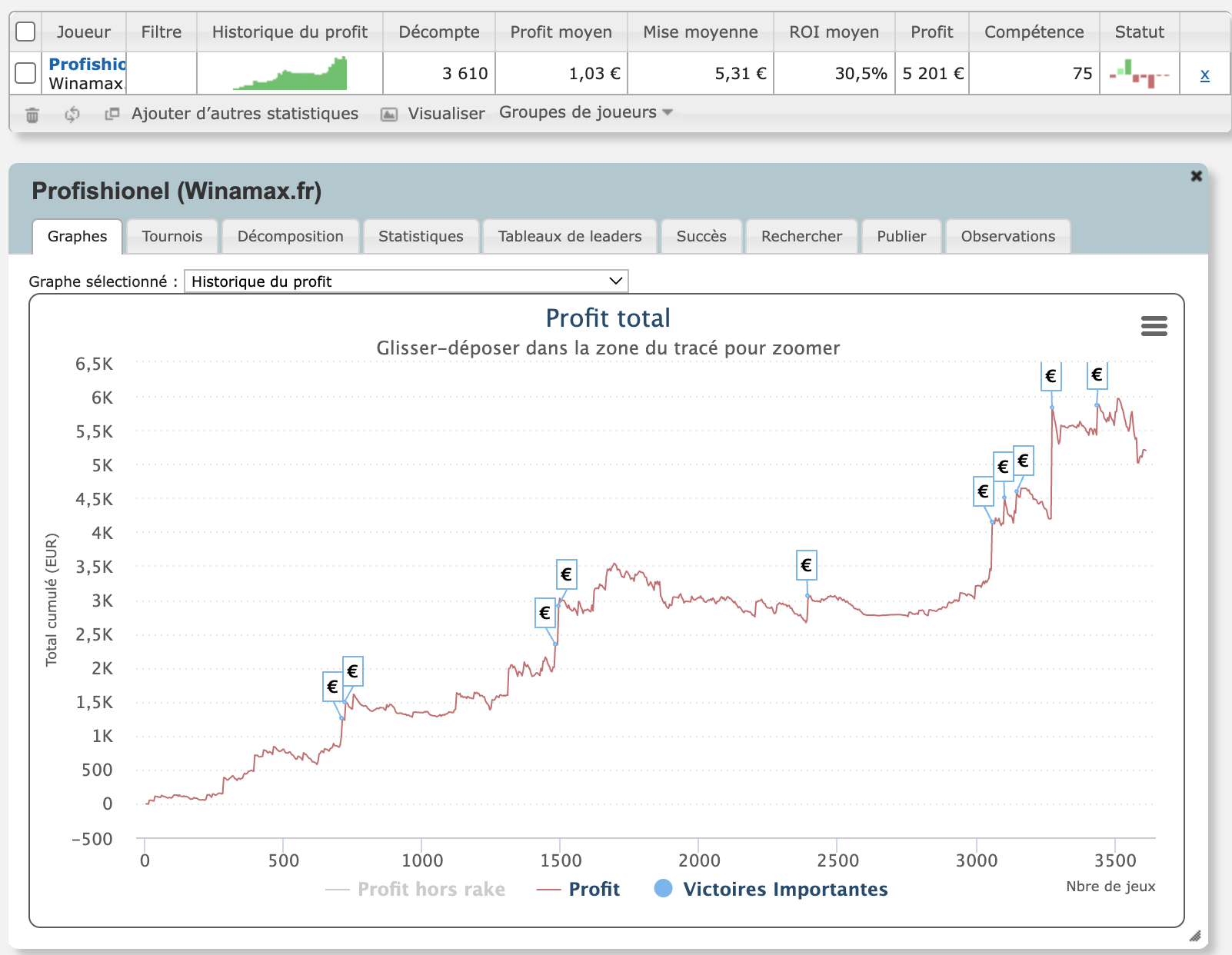 Actuellement je joue les tournois à 10€ et 20€, et j'ai environ un peu plus de 5000€ sur mon compte, sans jamais avoir redéposé un seul centime depuis le dépot de 10€