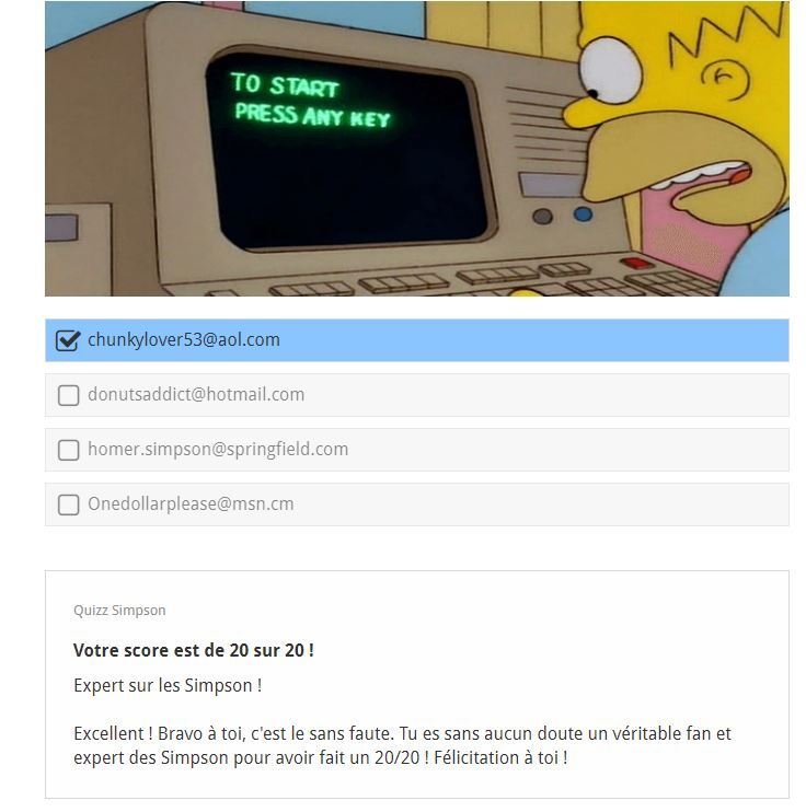 Le 29 avril 2023 à 23:07:29 : Votre score est de 19 sur 20 ! Bravo ! Bravo, tu as des connaissances solides sur Les Simpson ! Il ne te manque presque rien pour devenir un expert de la série mythique de Matt Groening. N'hésite pas à t'entrainer et à revenir tenter ta chance pour faire le grand chelem et le sans faute !