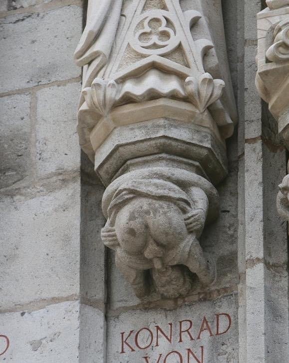 Personnage masculin pratiquant l'auto-fellation sous la statue de l'archevêque Konrad von Hochstaden,(Allemagne), vers 1406