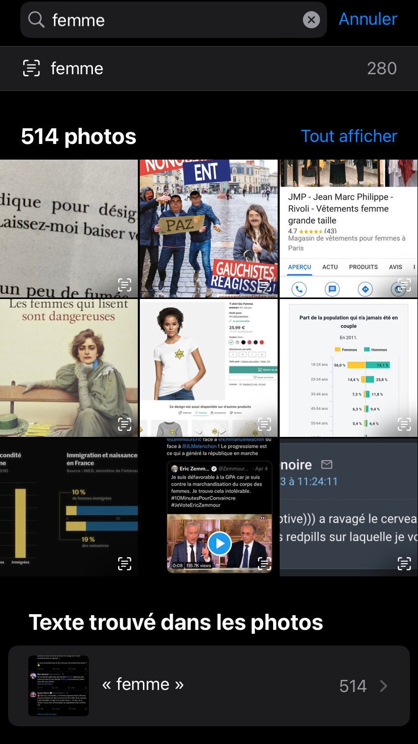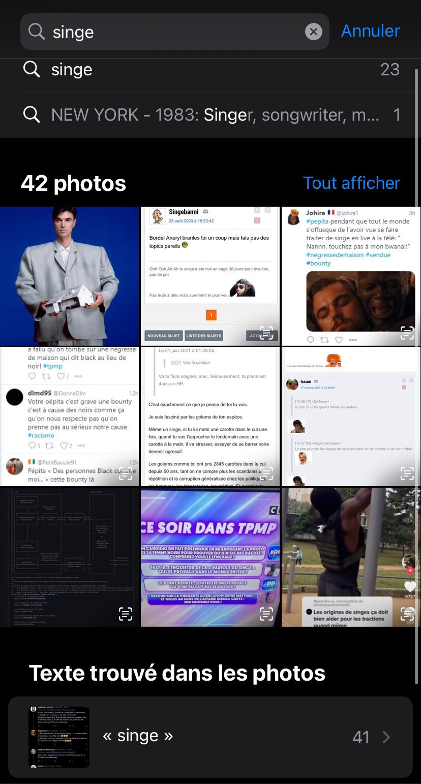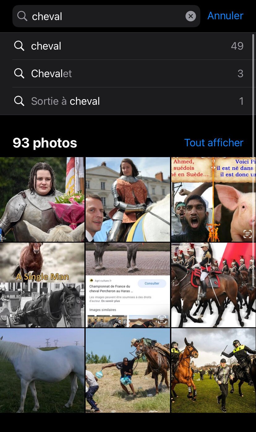 Cheval : (trouve mes photos de chevaux)Femme : (ne trouve que le mot « femme » dans des photos)Singe : (ne trouve que le mot « singe » dans des photos, sauf une photo qui contient « singer » dans ses métadonnées)
