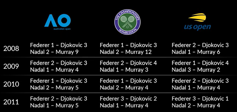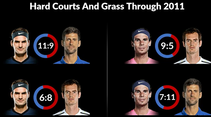 Federer a battu Djokovic 4 fois et n'a perdu qu'une seule fois avant 2008, alors qu'il était à égalité avec Murray : 1 - 1. D'un autre côté, Nadal n'a jamais perdu de match contre Murray, mais a perdu 2 de ses 5 matchs contre Djokovic. C'est encore plus évident quand on regarde les résultats de cette année à 2011 sur dur et gazon, Federer ayant gagné 11 fois contre Djokovic mais en ayant perdu 9 fois. Dans le même temps, il avait un bilan de 8 défaites pour 6 contre Murray. Alors que Nadal avait un bilan de 9 victoires pour 5 contre Murray, tout en ayant un bilan de 11 défaites pour 7 victoires contre Djokovic.