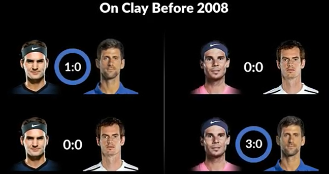 Le deuxième concept est celui des confrontations favorables pour Federer et Nadal. Avant 2008, Federer s'en sortait mieux contre Djokovic que contre Murray et Nadal s'en sortait mieux contre Murray que contre Djokovic.