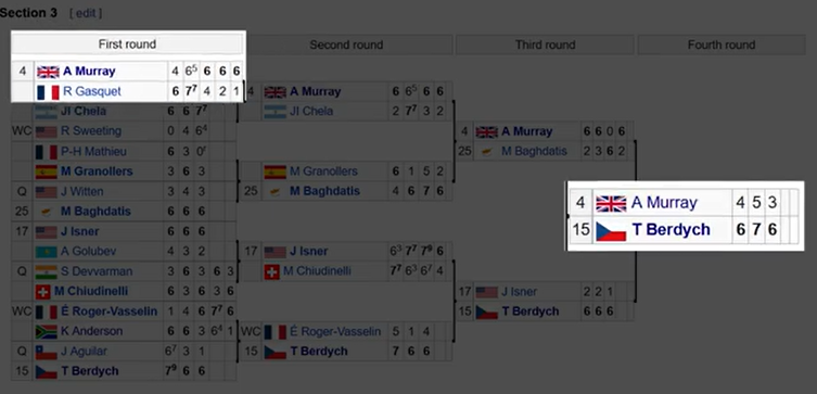 De plus, à chaque tirage, les 2 premières têtes de série sont dans des camps opposés. Ensuite, les têtes de série 3 et 4 sont placées dans des camps opposés. Tous les autres joueurs têtes de série sont tirés séparément des 4 premières. C'est important car on peut remarquer que dans 5 des tournois du Grand Chelem, Murray ne faisait pas partie des 4 premières têtes de série entre 2008 et 2011.