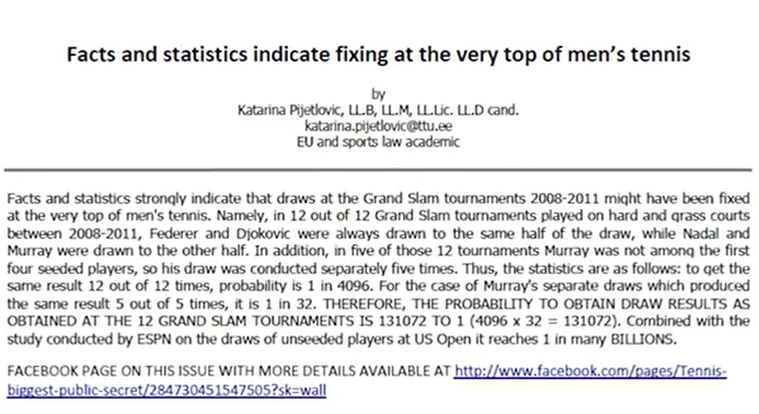 Après avoir examiné les preuves, toute personne raisonnable conclura que les tournois du Grand Chelem entre 2008 et 2011 ont été truqués. Malheureusement, beaucoup de gens sont déraisonnables et refusent d'admettre la vérité quand elle leur tombe sous la dent.