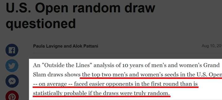 Si vous avez encore des doutes sur le fait que les tirages au sort sont truqués, l'article d'ESPN de 2011 le prouve. Le titre est : "Comment "Outside The Lines" a analysé le tirage au sort du tournoi de tennis de l'US Open".