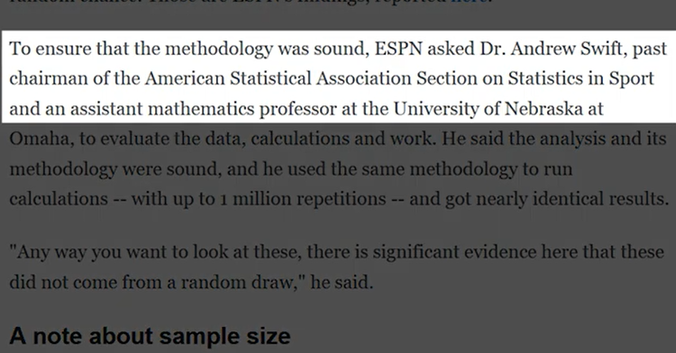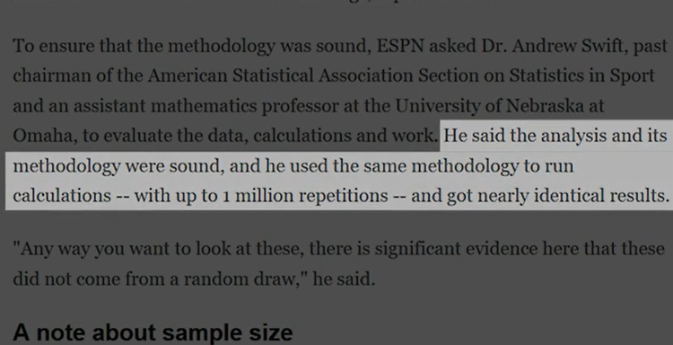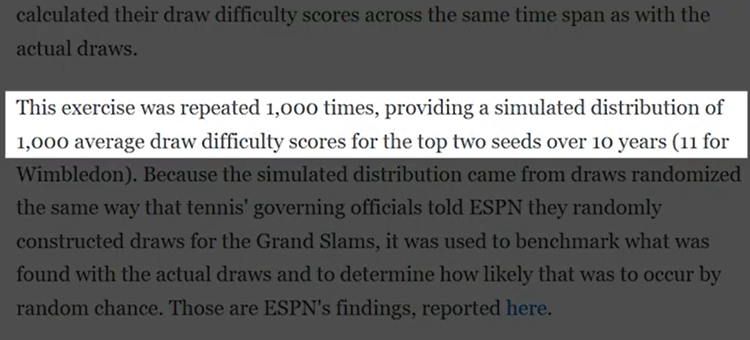 Non seulement il a confirmé que leur méthode était correcte, mais il a également effectué les mêmes simulations 1 million de fois et obtenu des résultats presque identiques. Il a déclaré qu'il y avait de bonnes raisons de croire qu'il ne s'agissait pas de tirages au sort. De 2001 à 2011, Federer a été tête de série 8 fois, Nadal 6 fois et Djokovic aux côtés de Murray seulement 1 fois chacun. Certains peuvent dire que les manipulations à l'US Open n'avaient pas pour but de favoriser des joueurs en particulier, mais seulement les deux premières têtes de série, qu'il s'agisse de Federer et Nadal ou non.