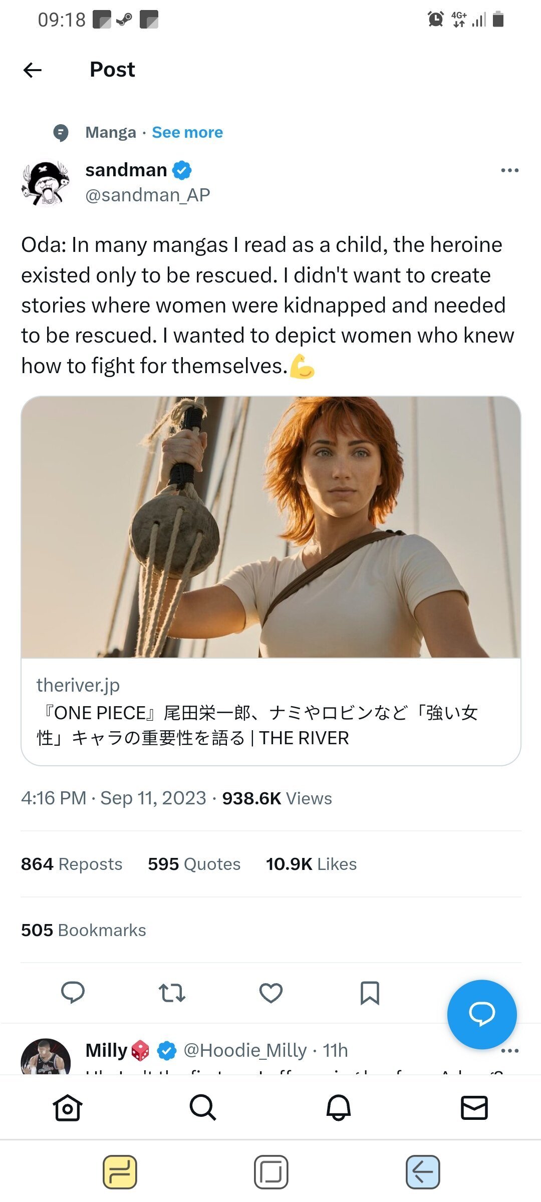 On pourrait être tentés de parler des plus fortes : Hancock, Yamato, Smoothie, Devon. Hancock est totalement sous l'emprise de Luffy et se fait sauver son cul 400x par Rayleigh. Yamato est carrément soumise MENTALEMENT par un homme (Oden) même après sa mort, Smoothie no comment, Devon un peu moins puisque apparemment l'équipage BN n'est pas vraiment un équipage mais elle reste un simple commandant. Big Mom c'est quasiment un mec dans un corps de femme.Aucune femme se bat pour elle même, elles sont toutes influencées par un homme peu importe comment.