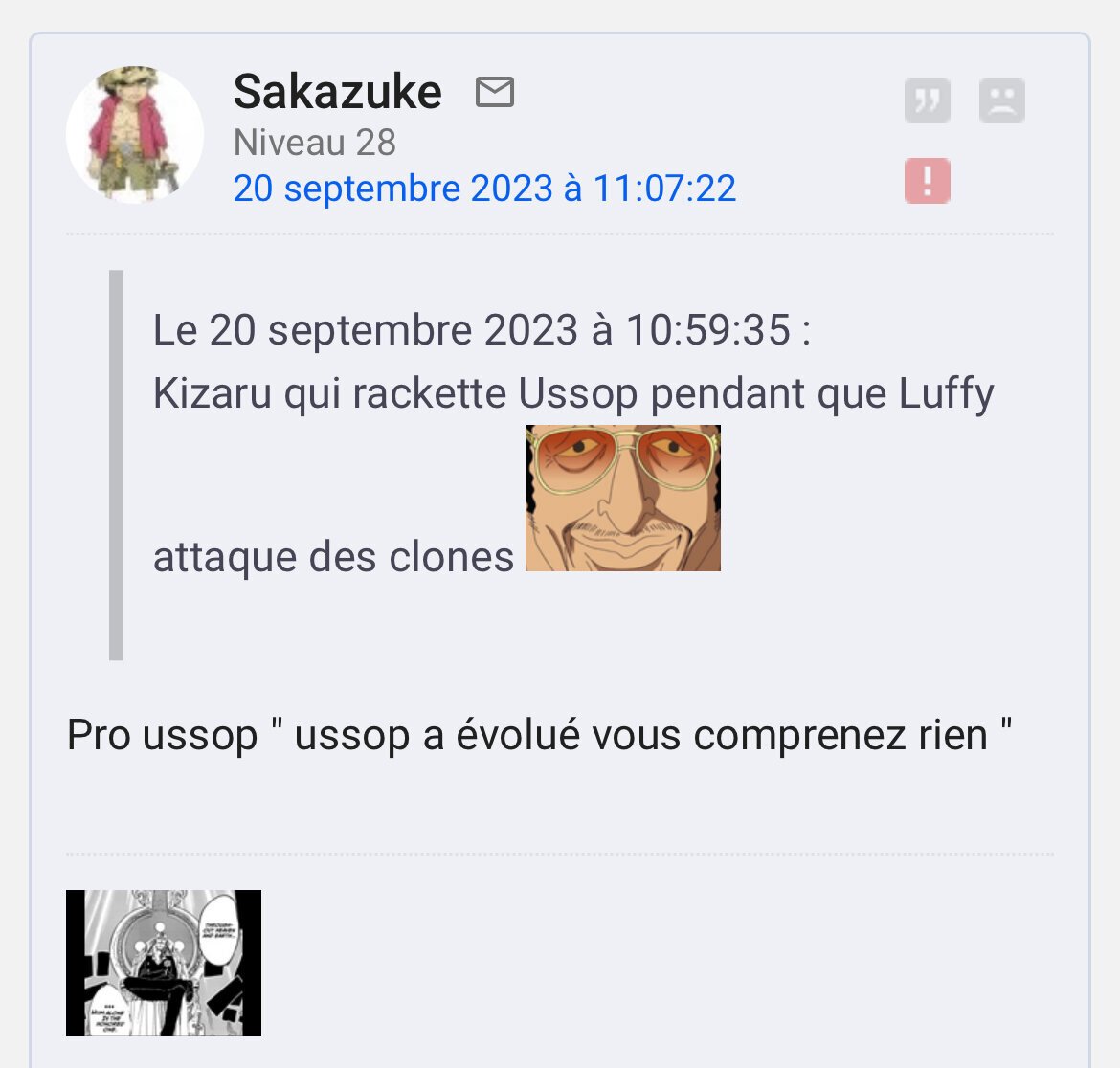 > Pendant ce temps vous mettez des avatars pseudos One Piece, vous passez votre temps sur ce genre de topics pour parler du manga que apparemment vous détestez tant pendant des heures