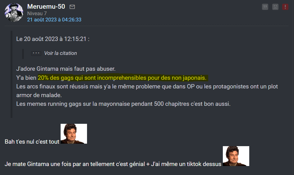 Je dis pas que tous les gags n'ont pas besoin d'explications, comme la scène où Gintoki s'excuse de la reprise de l'anime en 2015 l'explication du politique qui avait fait la scène originale était nécessaire (Mais les fainéants et terroristes de Crunchyroll ont retiré ça alors que les fansubs gratuits le faisaient gratuitement)