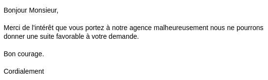 De plus, ces batards ne spécifient même pas pourquoi. Je me présente en personne. Ils me disent qu’ils sont intéressés, j’envoie mon CV, en 5 minutes ils me refusent.https://image.noelshack.com/fichiers/2016/26/1467335935-jesus1.png