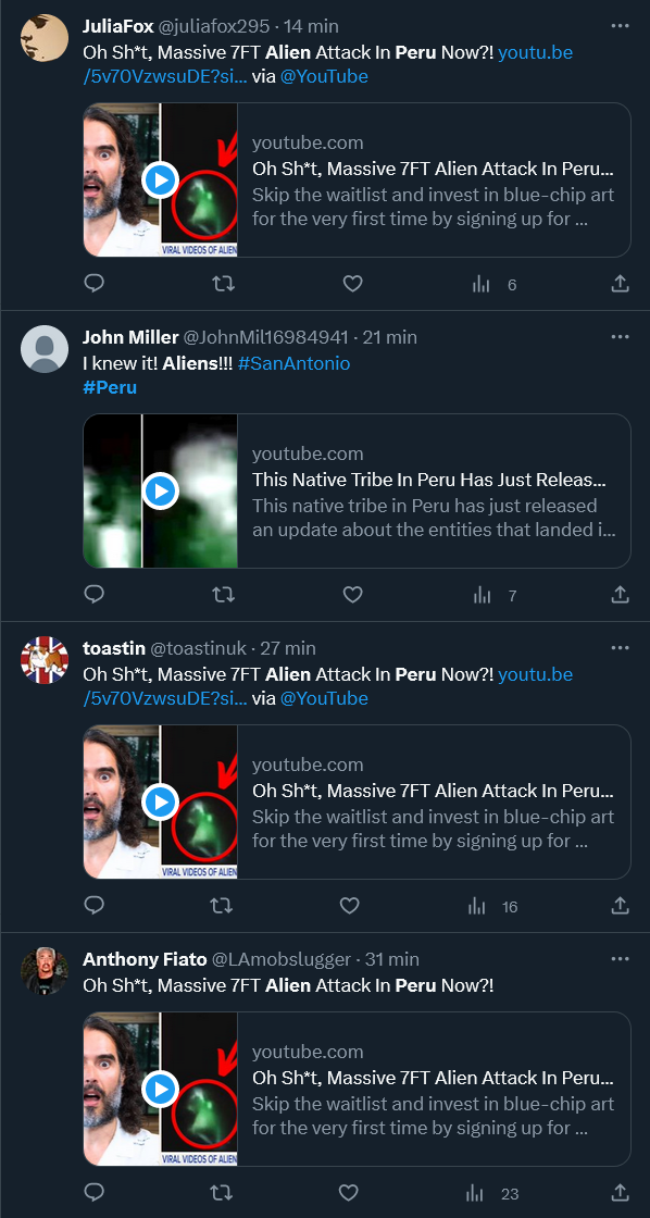Évidemment on peut remonter bien plus loin, là les ufolâtres ne sont pas dérangés par les bots qui cette fois sont bien réels. C'est comme ça depuis des jours alors qu'il n'y a absolument AUCUNE image ou vidéo du pseudo évènement.