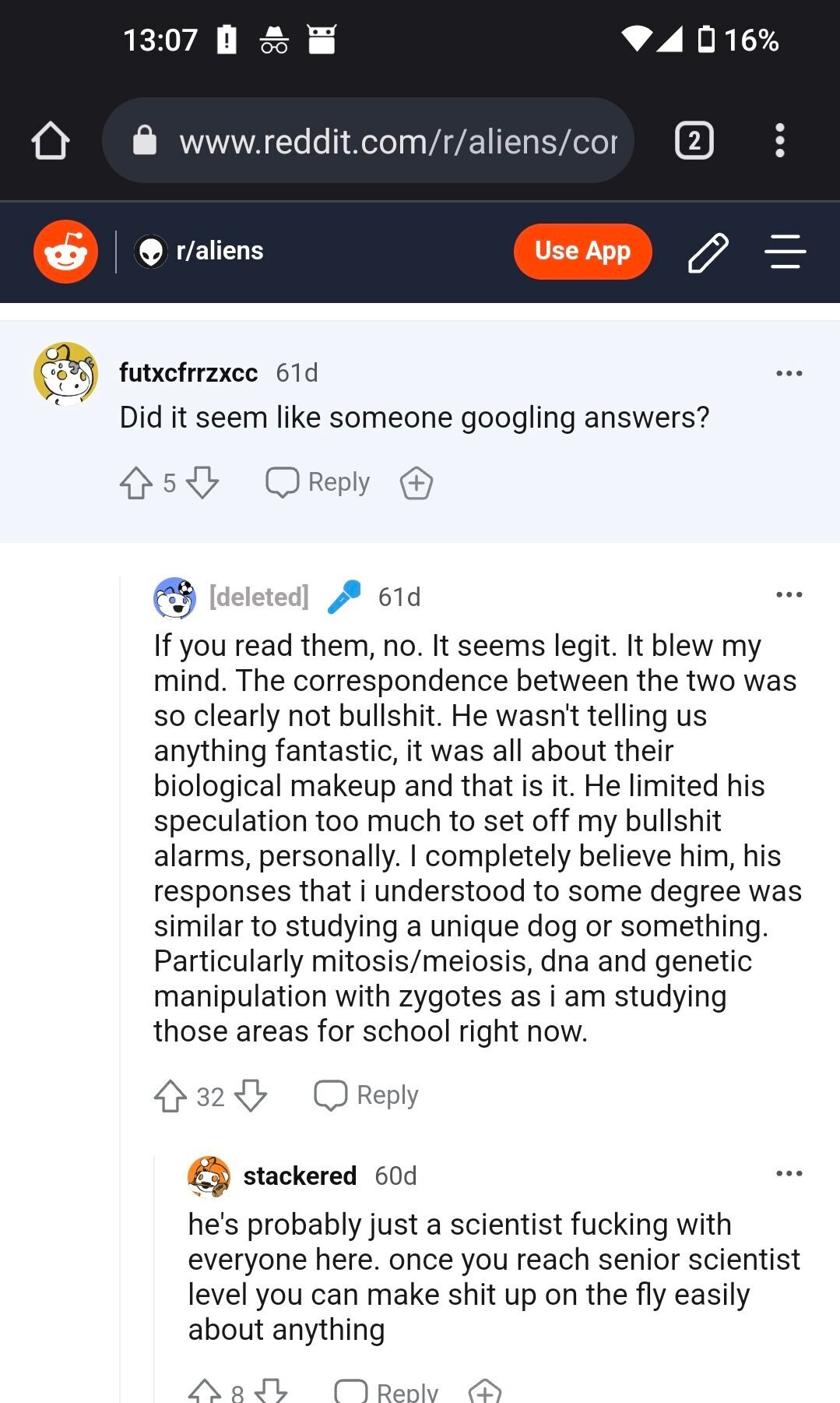 If you read them, no. It seems legit. It blew my mind. The correspondence between the two was so clearly not bullshit. He wasn't telling us anything fantastic, it was all about their biological makeup and that is it. He limited his speculation too much to set off my bullshit alarms, personally. I completely believe him, his responses that i understood to some degree was similar to studying a unique dog or something. Particularly mitosis/meiosis, dna and genetic manipulation with zygotes as i am studying those areas for school right now.Khoya le screenshot vient littéralement de mon portable j'ai pris le screenshot à 13:07