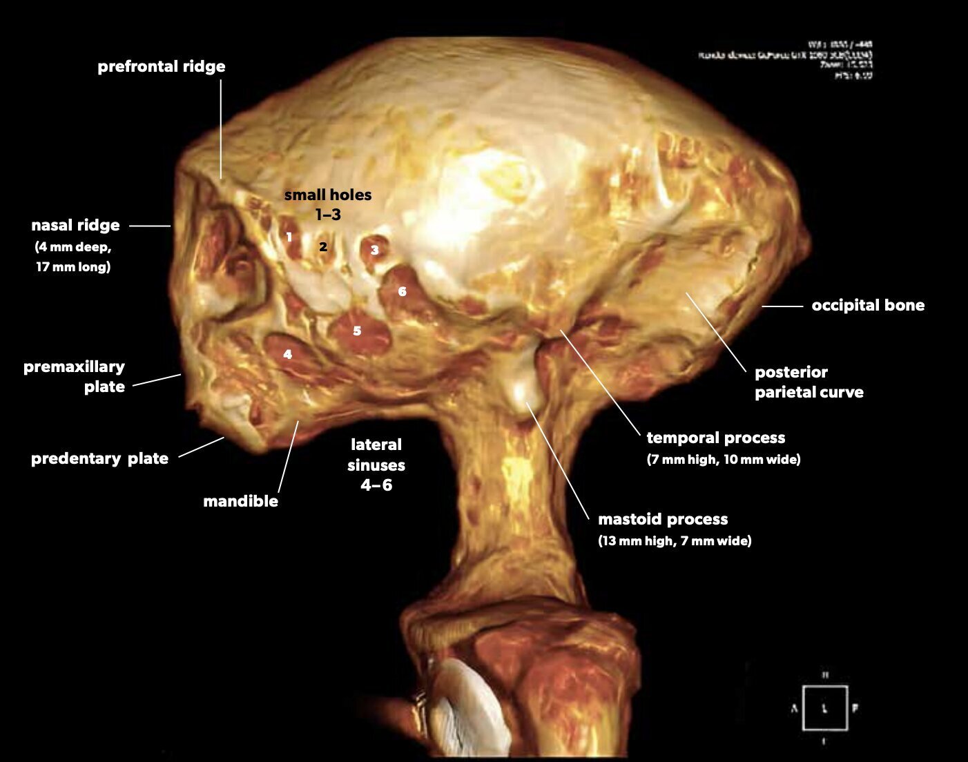 Ce qui m'interpelle immédiatement, c'est le mastoïde qui a été présenté comme "la" preuve qu'il s'agit d'un crane de veau...