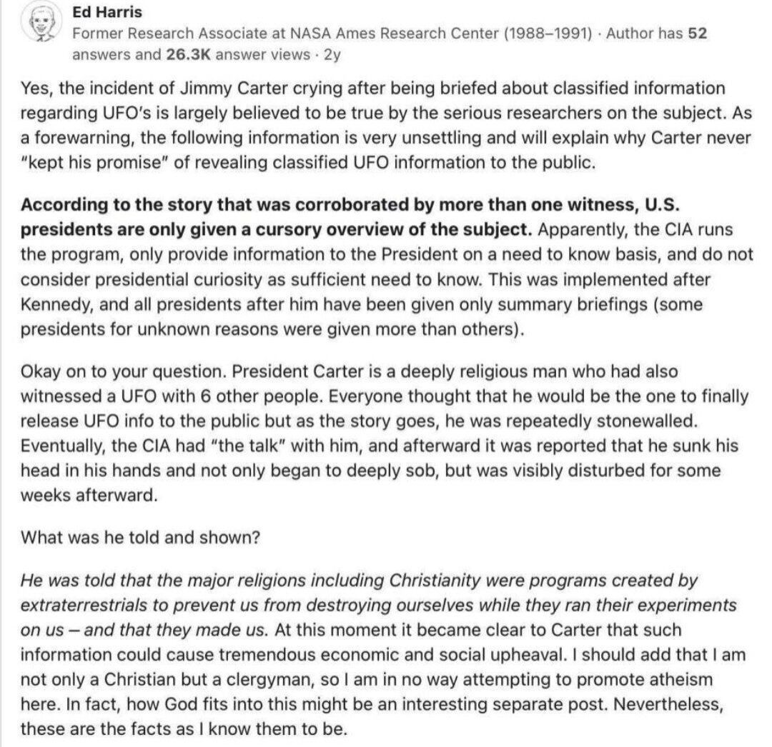 Le président Jimmy Carter voulait révéler la vérité mais le CIA lui a dit ce qu'il en était et il a préféré ne rien dévoiler ( les aliens auraient créés les religions, nous auraient créés et feraient des expériences sur nous )