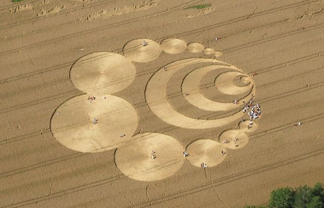 "La création des agroglyphes réalisés à partir de 1978 a été revendiquée par deux fermiers anglais, Doug Bower et Dave Chorley, dans la région d'Avebury dans le district de Marlborough. Ils expliquèrent plus tard[10] leur intention de faire une plaisanterie, inspirée par les « saucer's nests » d'Australie en 1966[7]"