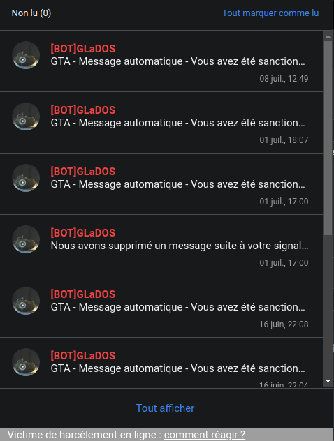 > > > > > Ayaa tu racontes quoi, t'aurai pu faire l’effort sur le formatage du texte pour assurer ton mensonge + ce n'est même pas ça le message envoyé par Glados, tu as un lien vers le karma et un paragraphe commençant par "Un administrateur a pris connaissance de votre dossier"