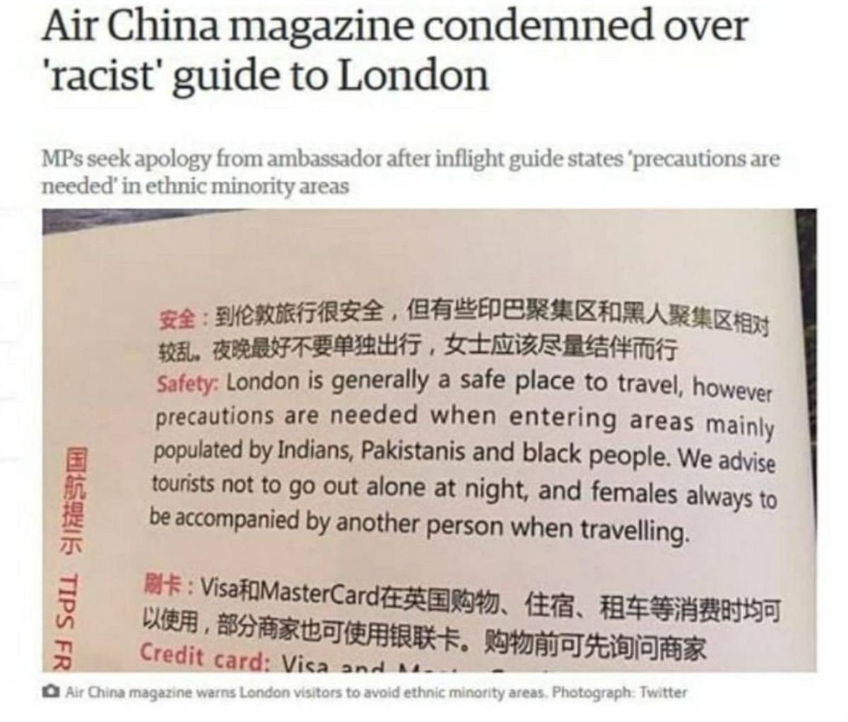 https://www.lefigaro.fr/flash-actu/2016/09/08/97001-20160908FILWWW00177-un-magazine-d-air-china-accuse-de-racisme.php "Londres est de manière générale une destination sûre. Cependant, des précautions sont nécessaires lorsqu'on se rend dans des zones principalement peuplées d'Indiens, de Pakistanais et de personnes noires","Nous conseillons aux touristes de ne pas sortir seuls la nuit, et aux femmes d'être toujours accompagnées"