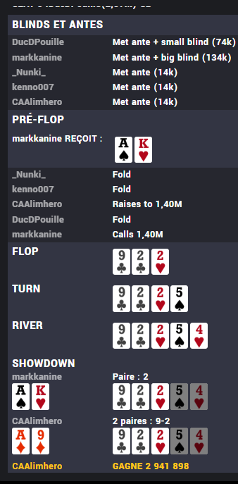 eux 22 ils doublent le stack, des limpeurs de merde avec 300BB, en étant aggro je donne juste de l'argent aux autres vu que je touche jamais jamais jamais rien et si je fais tapis ça donne des trucs surréalistes que j'ai mis en page précédente