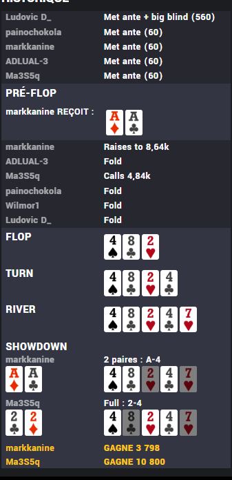 Car j'ai regardé 3-4 screens que t'as posté. Absolument aucun n'est un bad beat. Y'a des 60/40, des 70/30... Ce sont pas des trucs qui arrivent une fois par mois... Ce sont des trucs qui arrivent 20x par jour... Donc tu peux pas appeler ça des bad beats.