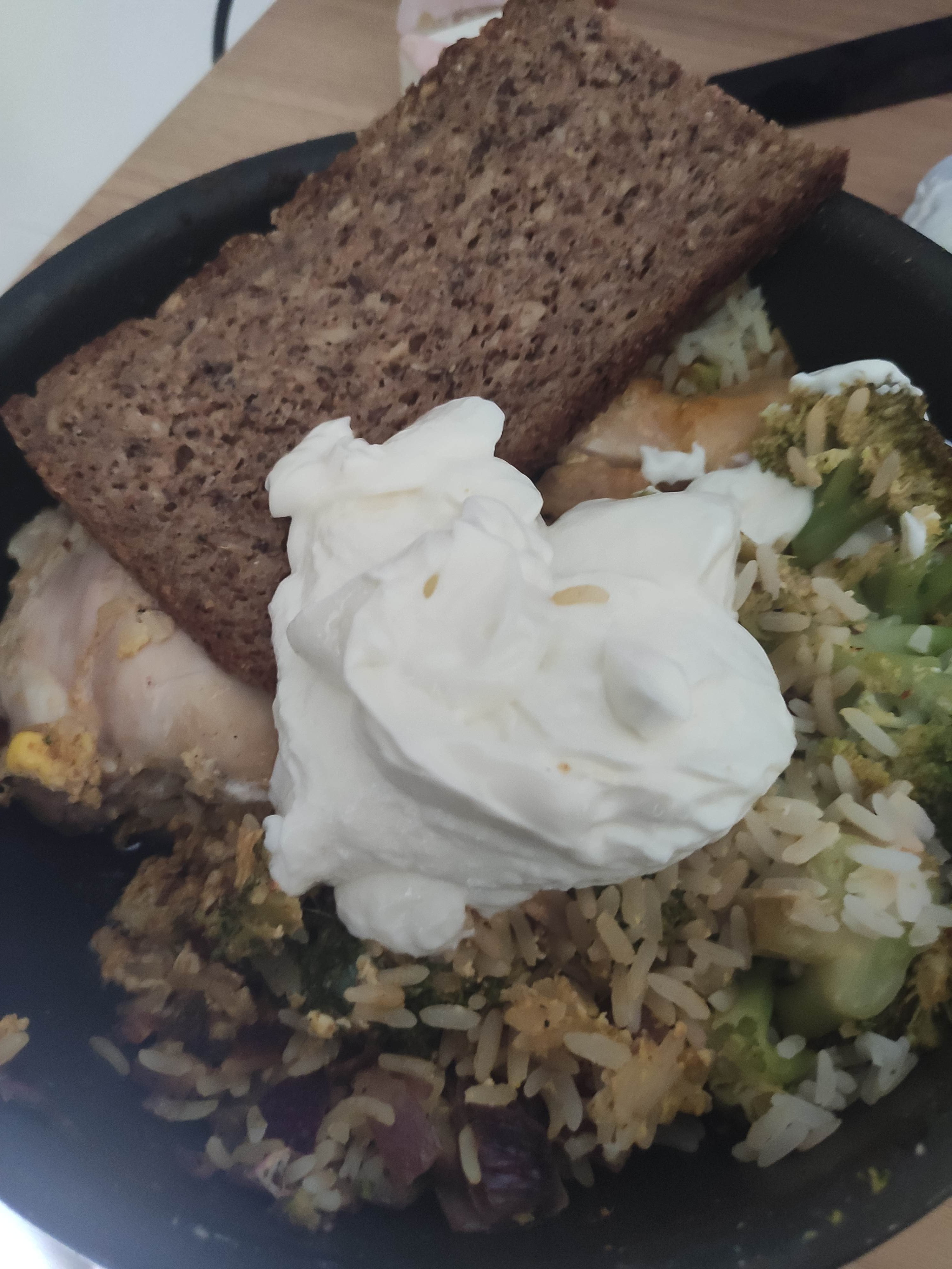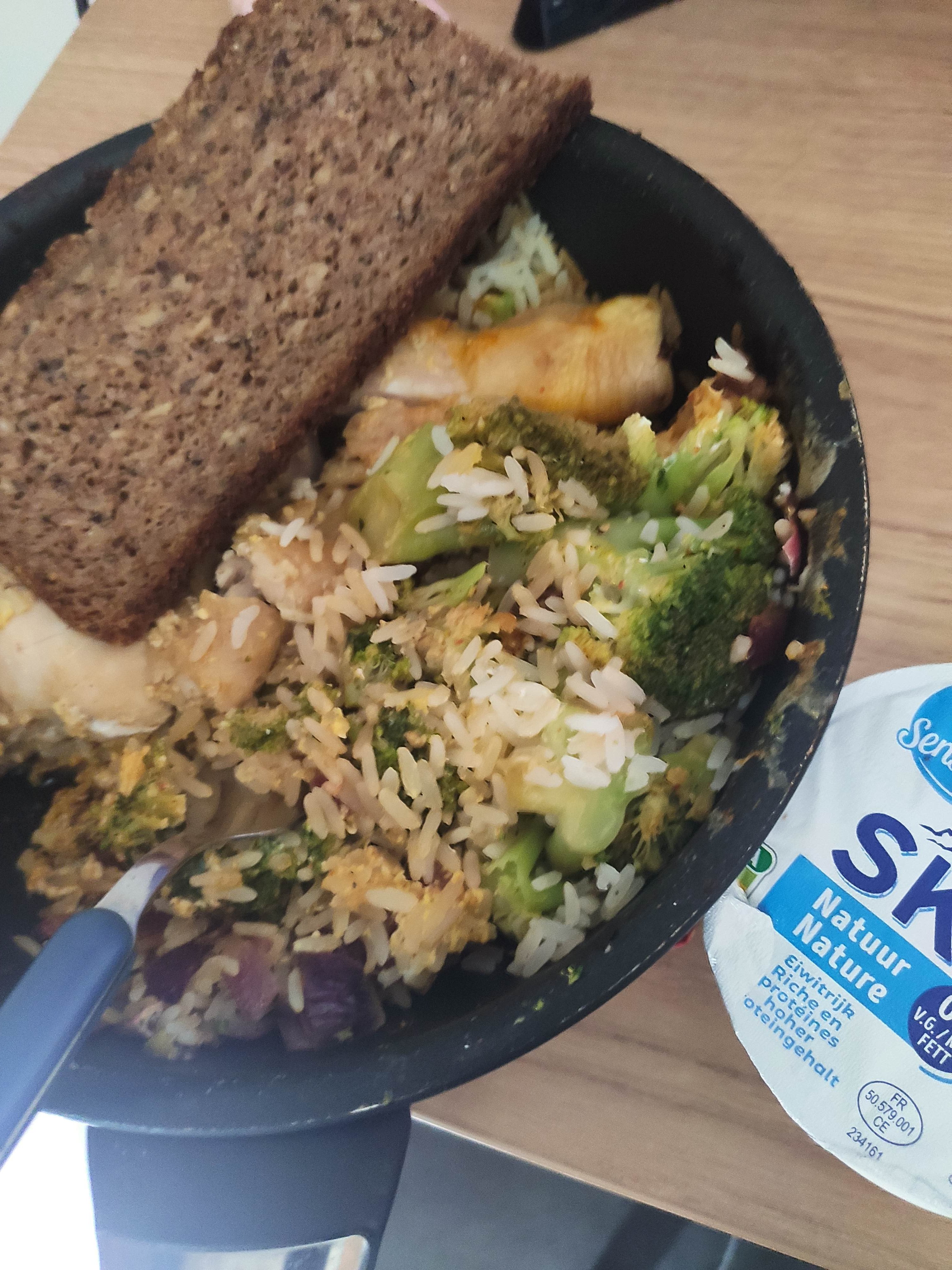 résumé du plat du soir1 cuisse de poulet1 oeufpain completskyrbrocoliriz longognon rougepincé d'huile d'oliveselépices