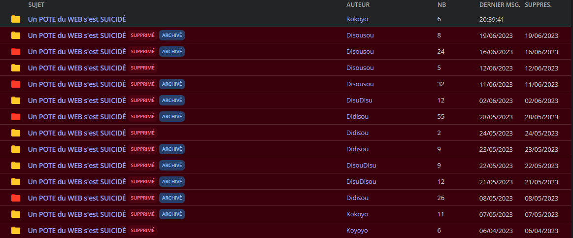 Ça faisait 2 mois qu'il ne s'était pas co, je l'ai stalk et j'ai réussi à trouver le numéro de chez ses parents Il s'est suicidé il y a 2 mois en sautant par la fenêtre comme Deleuze On se parlait tous les jours, sélection naturelle