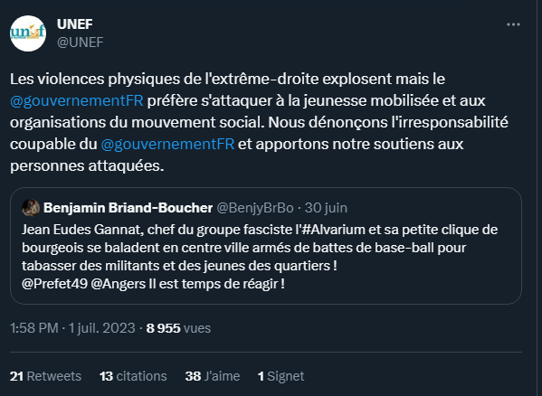 Les violences physiques de l'extrême-droite et le gouvernement français qui préfère s'attaquer à la jeunesse mobilisée et aux organisations du mouvement social.