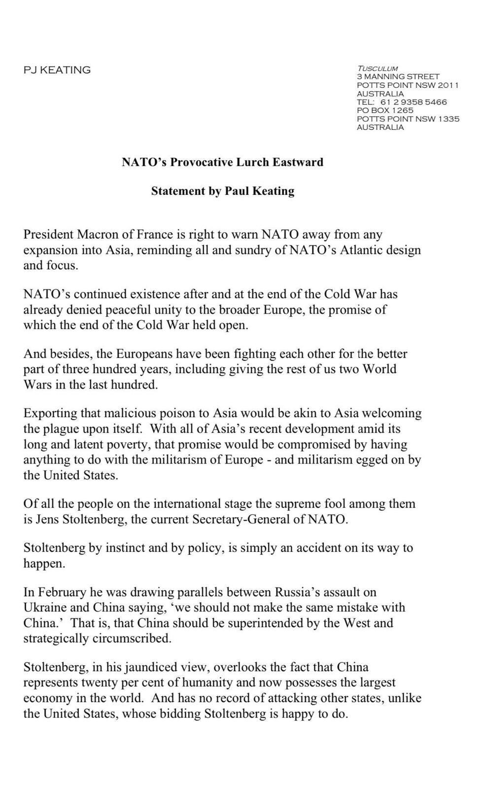 Former prime minister Paul Keating has continued his defence of China’s rise and savaged NATO boss Jens Stoltenberg as a “supreme fool” as the military bloc looks to expand its influence to Asia.