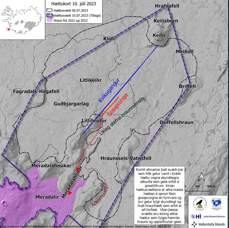 conséquence: il y a donc une probabilité qu'une nouvelle faille s'ouvre plus au nord, dans la direction du dyke (concentration de magma sous forme de long filon) sur les flancs du Keilir ou encore plus au nord.