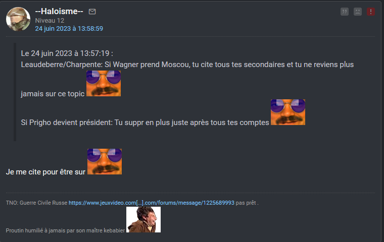 Ayaaaaooooo le topic qui vire en discussion de golems entre les bot atlantistes en sang qui prennent pls sur pls mais tentent de rester debout et les soutiens russe qui s'acharnent sur un mec déjà a terre comme IRL avec l'Ukraine ahiiiiiiii, remarque c'est un divertissement comme les autres je vais pas me plaindre![]()