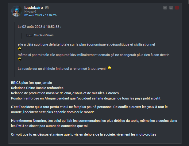 Je passe une fois ou deux par semaine pour troller ils sont toujours là a boucler sur la même propagande atlantiste médiocre, j'aurais leur vie je me flinguerais je pense no joke