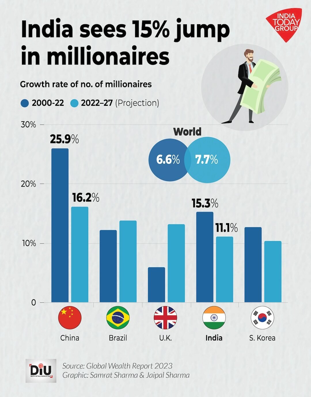 « However, by 2027, China (including Hong Kong and Taiwan), India, Brazil, the UK, and South Korea are expected to see the fastest rise in millionaires. »