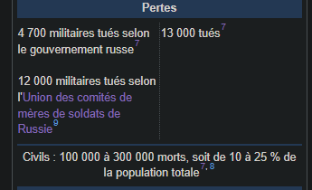 N'empêche c'est toujours hilarant de voir la Russie pleurer au "génocide du Donbass" quand on sait que l'Ukraine n'a fait "que" 3000 morts civiles en 8 ans dans le Donbass alors qu'a coté la Russie a elle même fait plus de 80 000 morts civiles en 10 ans en Tchétchénie