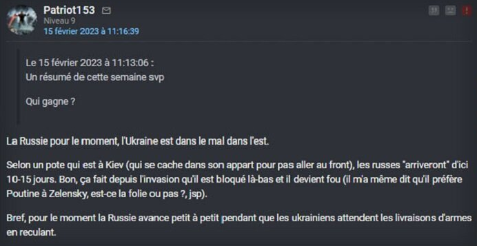 Vous en avez pas marre de dire des conneries h24 ? Au lieu de s*cer l'Ukraine, vous voulez pas bosser afin de soutenir l'économie française ?ça va faire 1-2 mois je suis plus passé ici, je vois l'Ukraine galérer autant qu'un noob sur DayZ et j'arrive à lire que la Russie est entrain de se faire défoncer...mais faut arrêter la drogue au bout d'un moment. Il est temps de prendre l'air les gars au lieu d'être h24 sur ce forum.