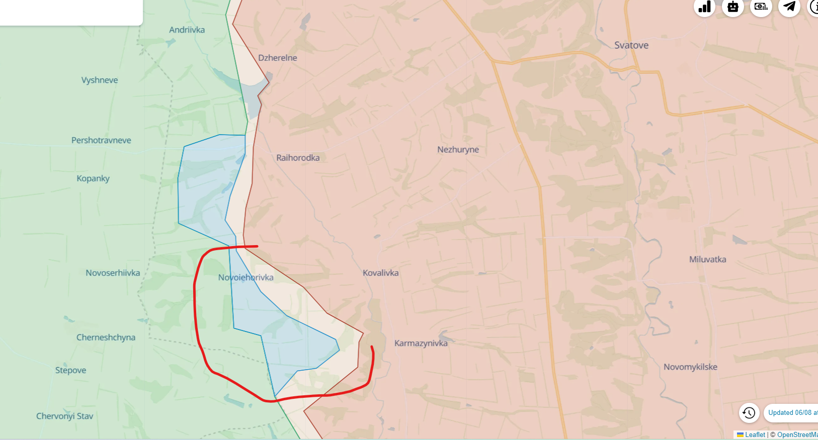 J'ai pas trop suivi le front ces derniers jours mais apparemment l'offensive russe par-delà la rivière Zherebets (axe Svatove) a été stoppée pour de bon par les ukrainiens, ces derniers ont repris hier 7 km² dans ce secteur dont le village de NovoiehorivkaJe crois que c'est le seul changement de ces derniers jours.