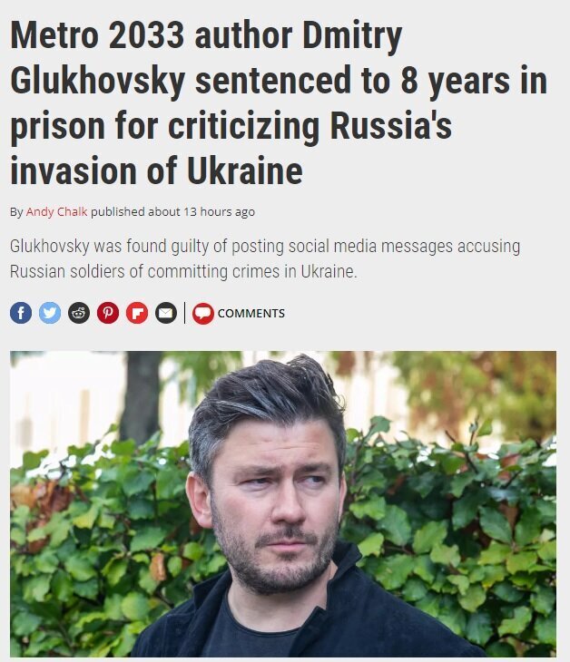 > Dmitry Glukhovsky, auteur de la série littéraire de science-fiction russe Metro, a été condamné par contumace à 8 ans de prison pour avoir accusé des soldats russes de crimes de guerre sur les réseaux sociaux.