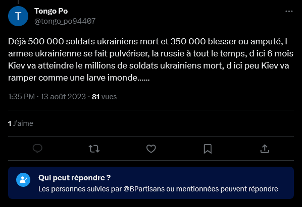 Les BotRusse qui donne de vrai argument avec des video a l'apuis alors que les UkroBot se contente de agneugneu "Beaucoup de Tongo Po sur le topic aujourdhui"Ayaaa merci à jv archve qui, sans surprise, m'apprends que tu es algérien