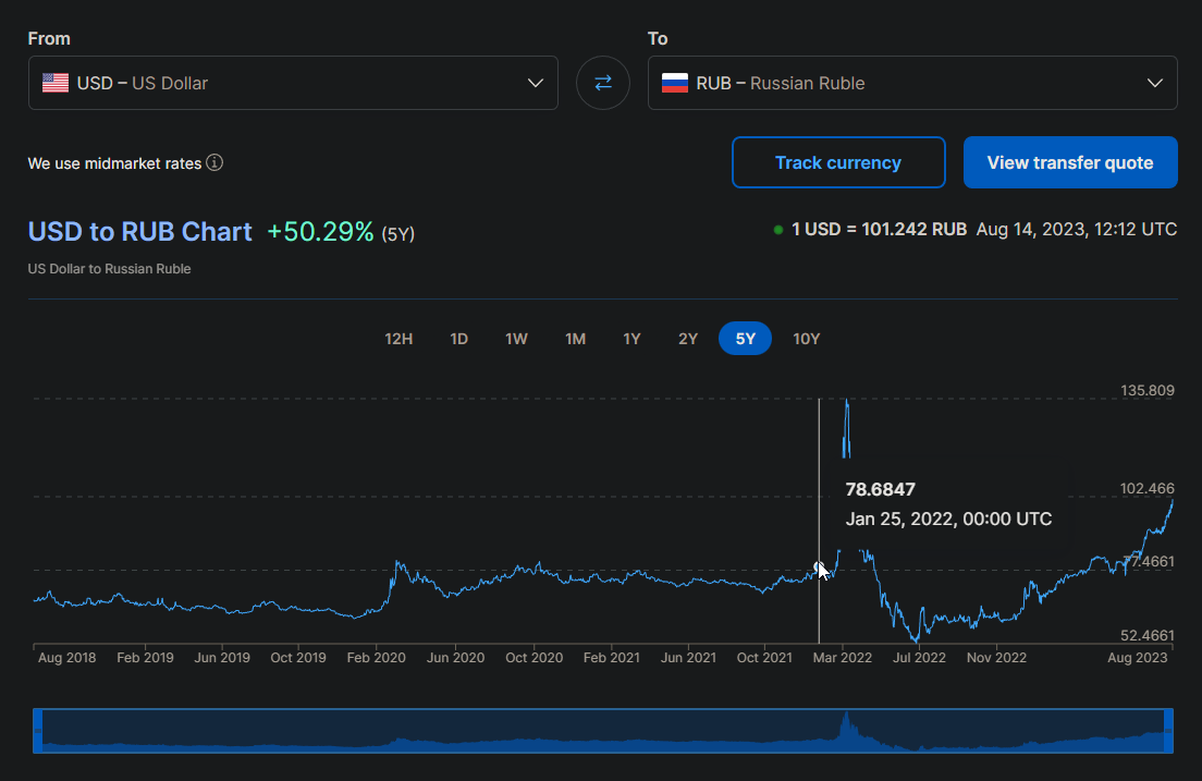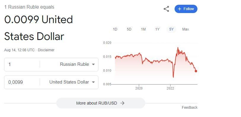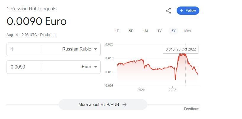 Petit dezoom sur sur le cours du rouble pour voir qu il est peine en dessous de ce qu il etait avant l invasion.Le 14 août 2023 à 14:03:35 :