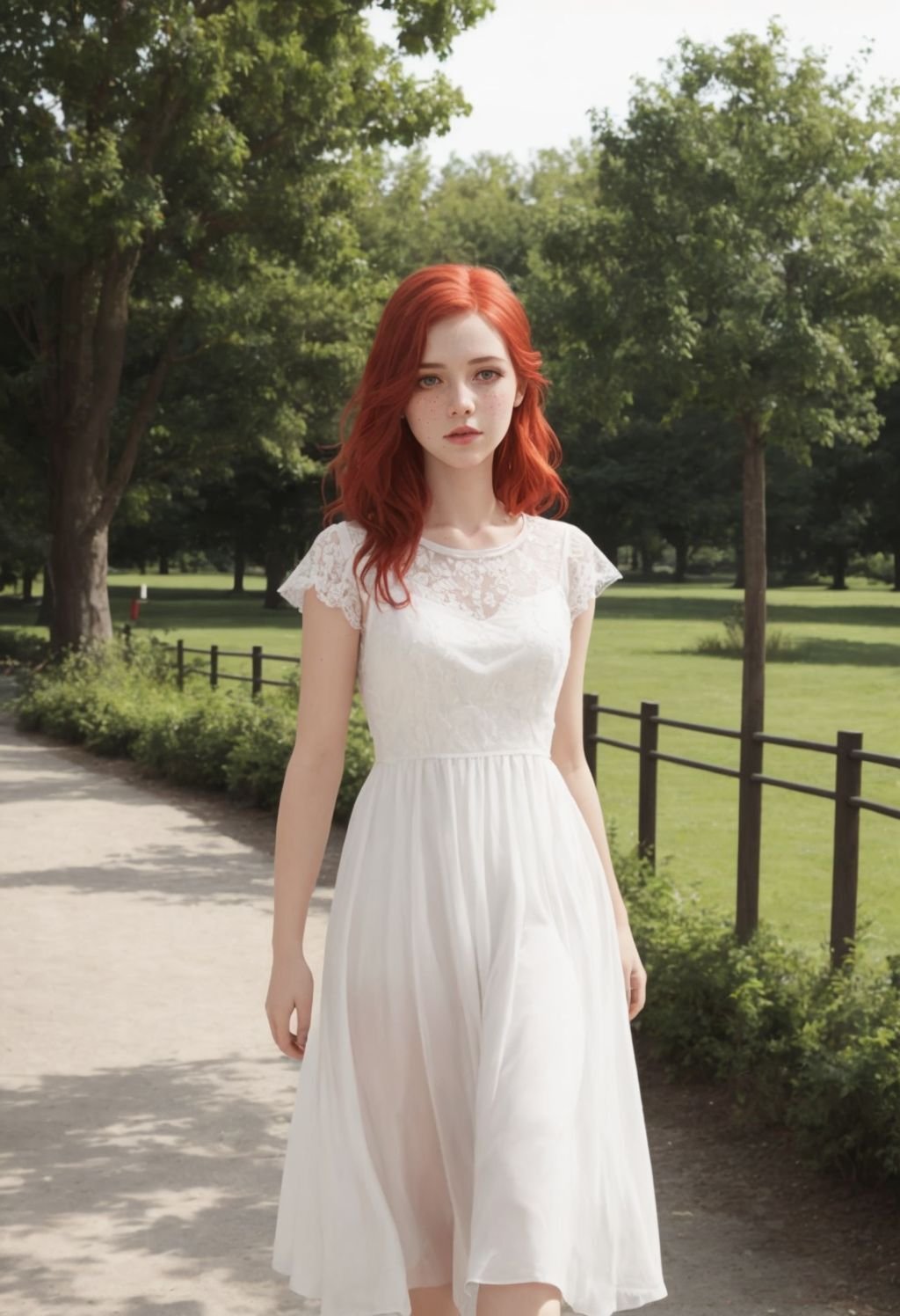 Une rouquine avec des tâches de rousseur et des yeux marrons/rouge.