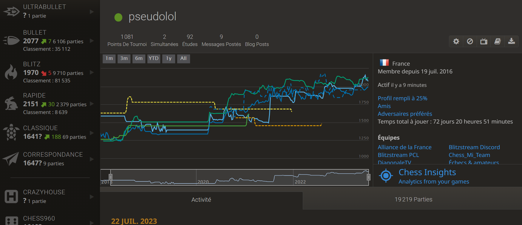 - 2150 elo rapides, 2180 bullet en max, 2080 en blitz