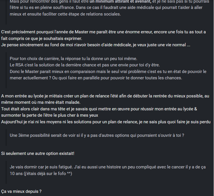 Je souscris à 100% pour le RSA, je crains que cela soit la fin. De l'autre côté je n'ai plus la force pour le Master, j'ai l'impression d'être coincé et que tout est finit