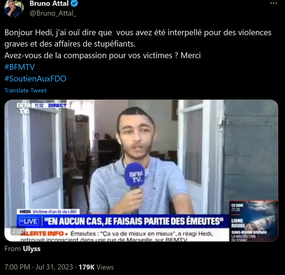 Selon Bruno Attal ( qui se prendrait un procès en diffamation s'il mentait sur ce genre d'affaire)Notre petit ange Hedi qui passait innocement par là en rentrant d'une dur journée de labeur serait un multi recidiviste déjà connu pour des faits de violence GRAVE et d'affaire de stupédiant https://twitter.com/Bruno_Attal_/status/1686059391995330561