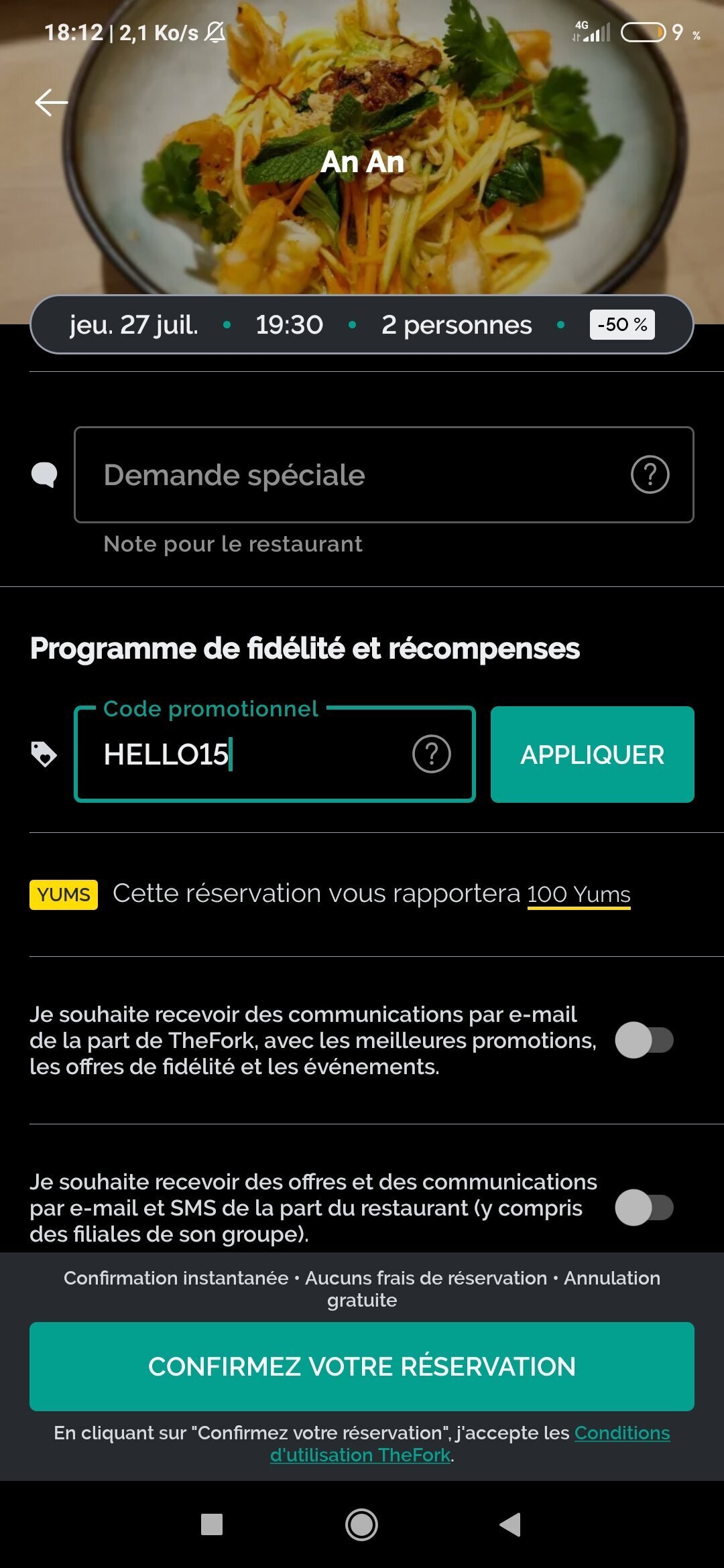 > Si tu n'as jamais réservé sur la fourchette utilise le code HELLO15 qui te donne 15€ offert sur 25€ d'addition CUMULABLE AVEC LES OFFRE 20-30-40-50%