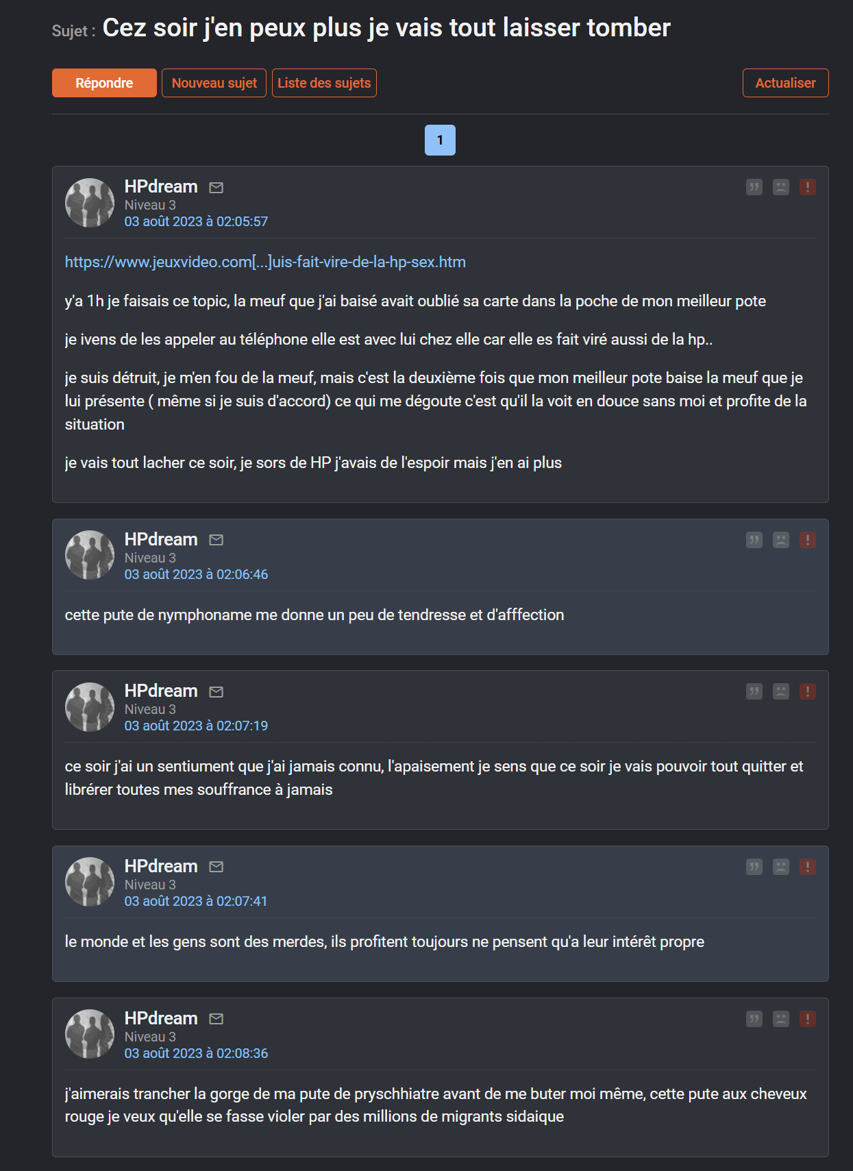 on a des fichés S dans la nature, dont on sait très bien qu'il peuvent passer à l'action. tu crois qu'ils va se passer quoi quand ils vont recevoir ton message de puceau, accusant un autre puceau sur une phrase sur jvc ?