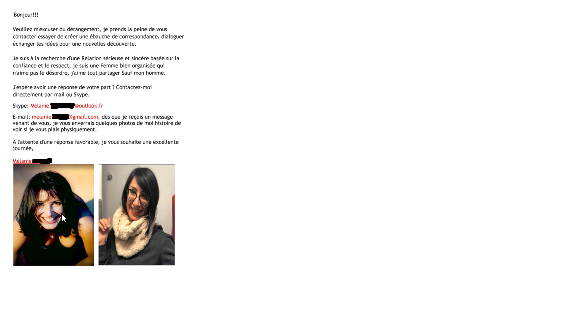 Ahi quand l'OP va s'apercevoir qu'il a pas affaire à Mélanie mais Mamadou et sa bande