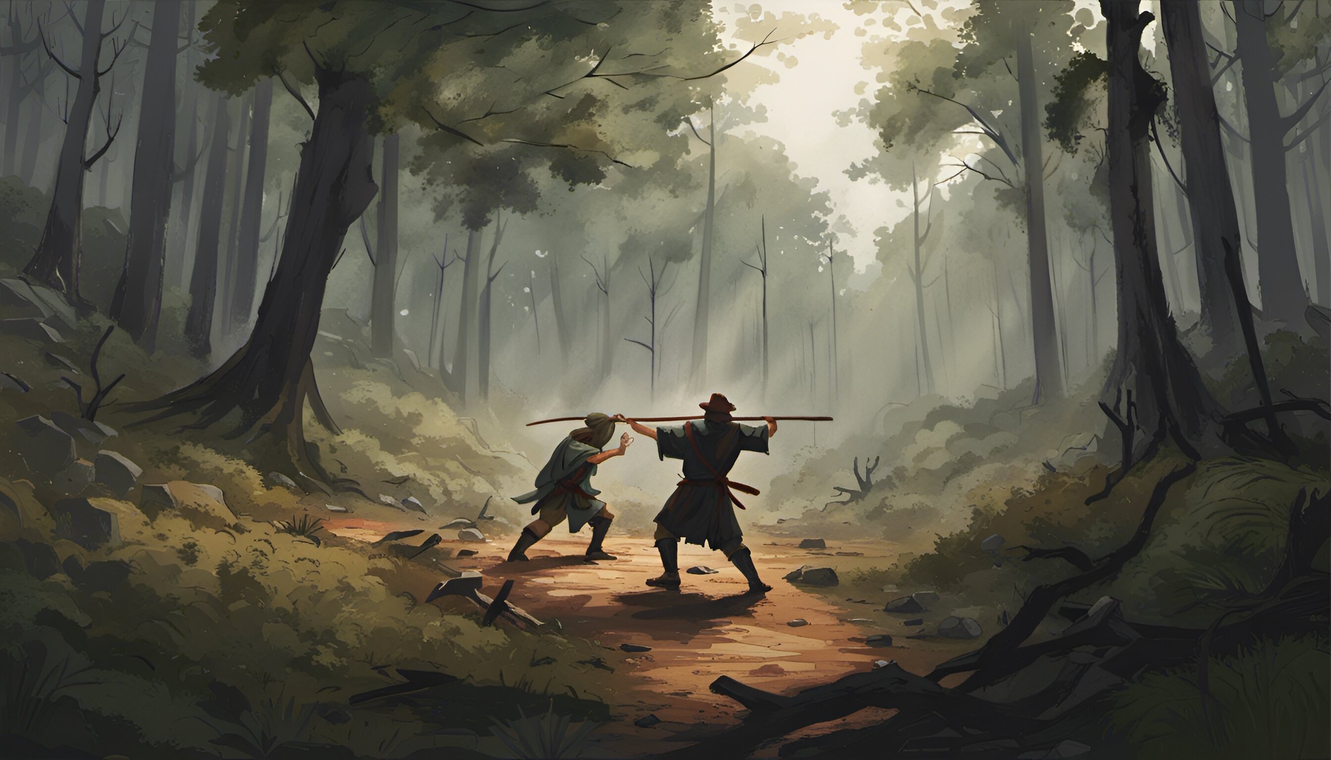 Vous tentez maladroitement de repousser l'agresseur de la pointe de votre propre bâton mais la douleur vous empêche de viser convenablement. Le paysan ricane découvrant ses dents jaunies