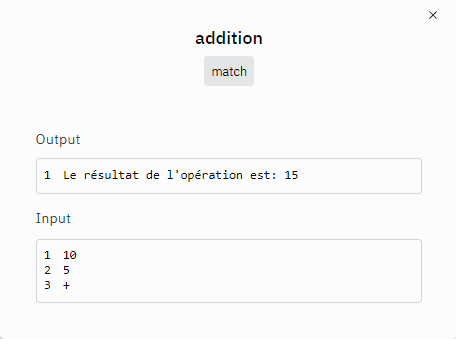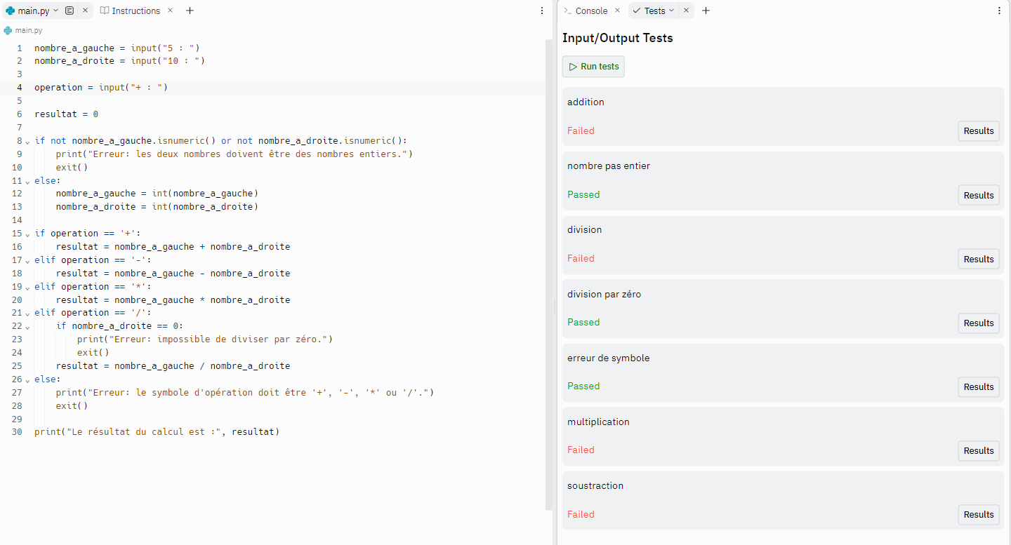 # Étape 1: Demander les nombres à l'utilisateur nombre_a_gauche = input("5 : ") nombre_a_droite = input("10 : ") # Étape 2: Demander l'opération à l'utilisateur operation = input("+ : ") # Étape 3: Initialiser la variable resultat resultat = 0 # Étape 4: Vérifier les nombres entiers if not nombre_a_gauche.isnumeric() or not nombre_a_droite.isnumeric(): print("Erreur: les deux nombres doivent être des nombres entiers") exit() # Convertir les entrées en entiers nombre_a_gauche = int(nombre_a_gauche) nombre_a_droite = int(nombre_a_droite) # Étape 5: Vérifier le symbole et effectuer le calcul en utilisant match match operation: case '+': resultat = nombre_a_gauche + nombre_a_droite case '-': resultat = nombre_a_gauche - nombre_a_droite case '*': resultat = nombre_a_gauche * nombre_a_droite case '/': if nombre_a_droite == 0: print("Erreur: impossible de diviser par zéro") exit() resultat = nombre_a_gauche / nombre_a_droite case _: print("Erreur: le symbole d'opération doit être '+', '-', '*' ou '/'") exit() # Étape 6: Afficher le résultat print("Le résultat est :", resultat)?